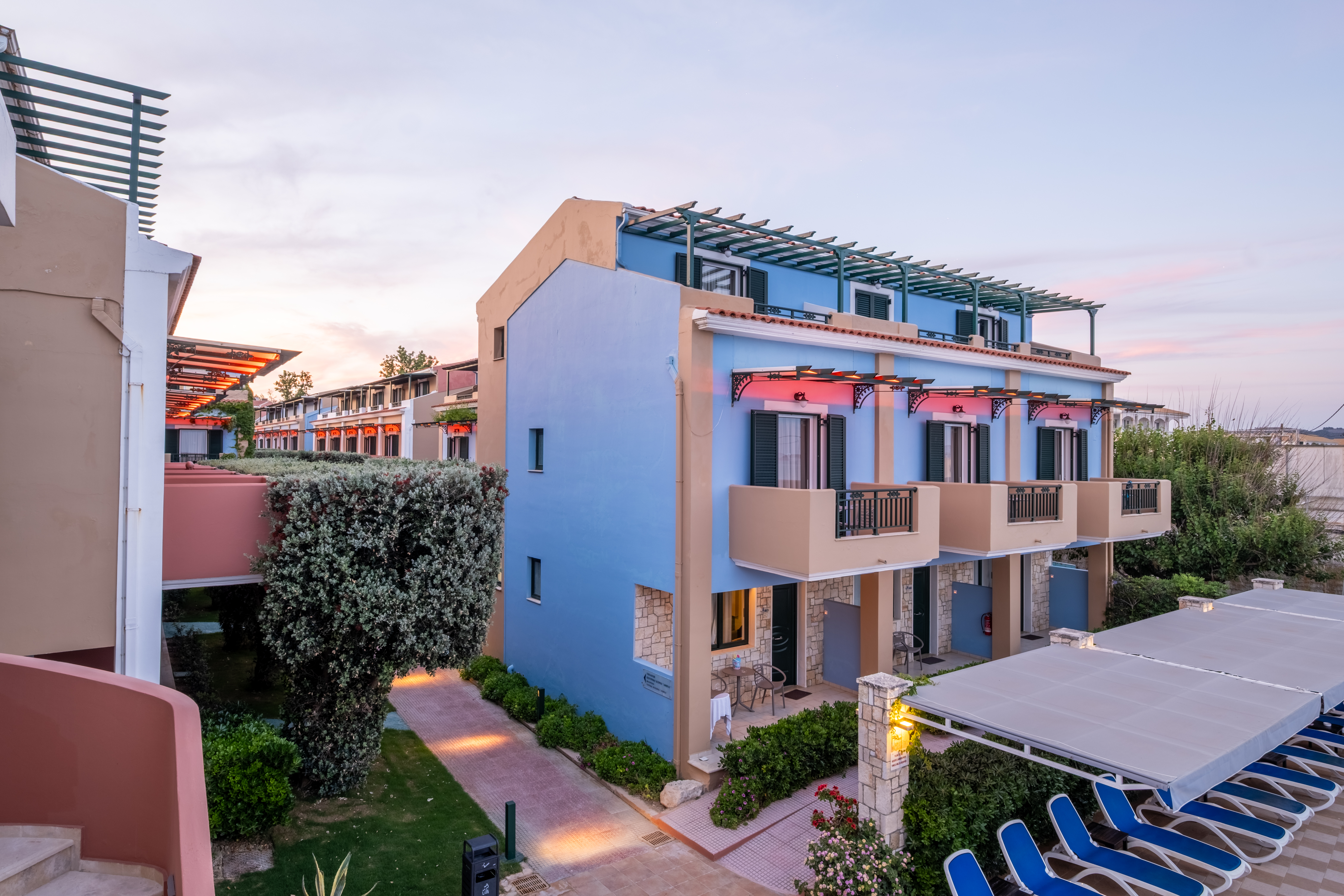 The Hotel is located on the Beach in Laganas area. The resort consists of eight two-storied buildings in the authentic style of a traditional Ionian Village and offers superb accommodation in 117 tastefully decorated standard rooms, family rooms and suites. Set in colourful gardens, the complex facilities include a main building with an impressive reception area with a currency exchange, a spacious lounge with a bar and an elegant restaurant. Conference facilities are available along with room and laundry services on request. The snack bar is open during the day offering light snacks and refreshments. The rooms include twin beds or double bed, bathroom with bath or shower and WC, hairdryer, satellite TV with music channels, telephone with Internet access, a fridge, safe, individual air conditioning and a balcony or terrace. A large outdoor swimming pool with sun loungers and parasols is on offer.