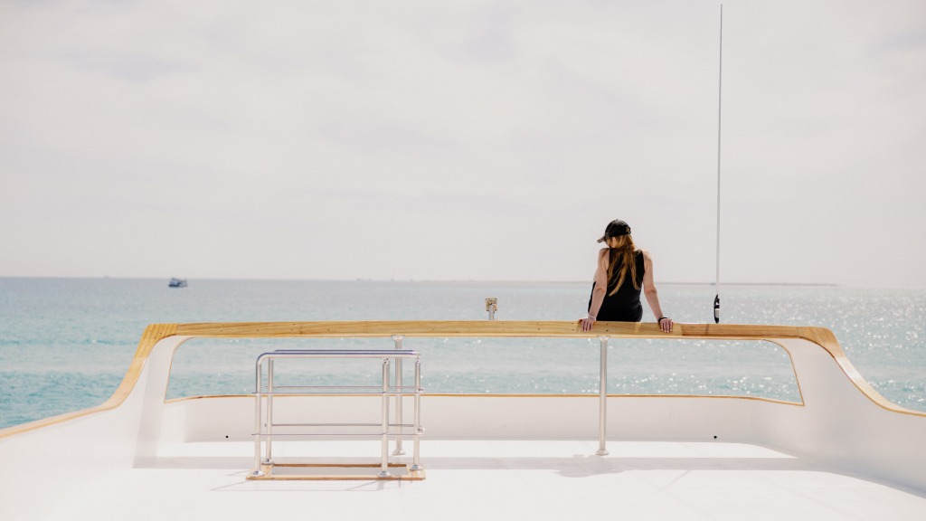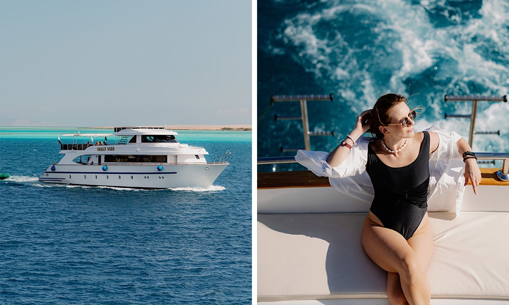 - Excursie cu barca din Dahab. Relaxare pe punte în timp ce barca plutește peste Golful Aqaba.